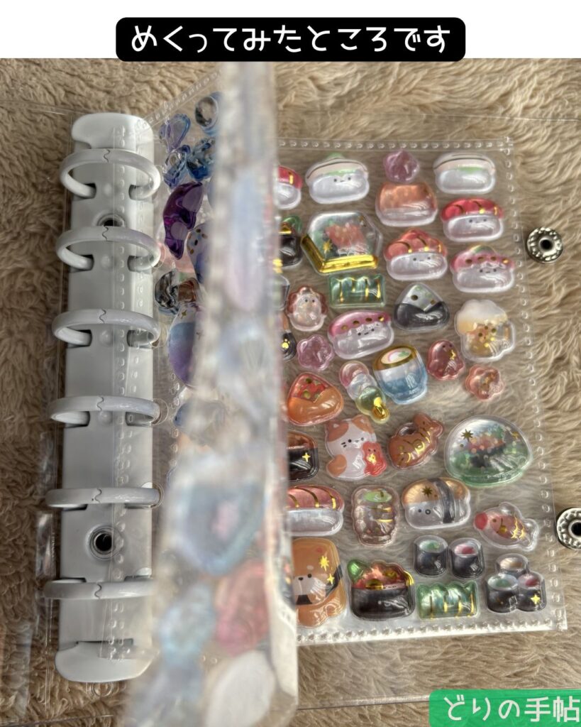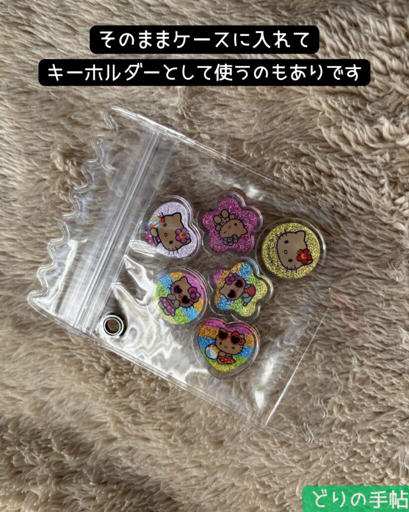 下の写真のように、シールを並べて入れて、キーホルダーにしてシール帳につけたりしています。